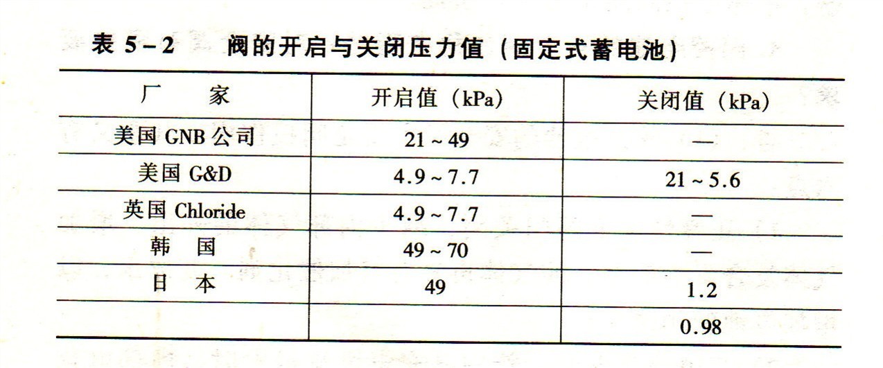 表5-2 閥的開啟與關(guān)閉壓力值(固定式蓄電池)
